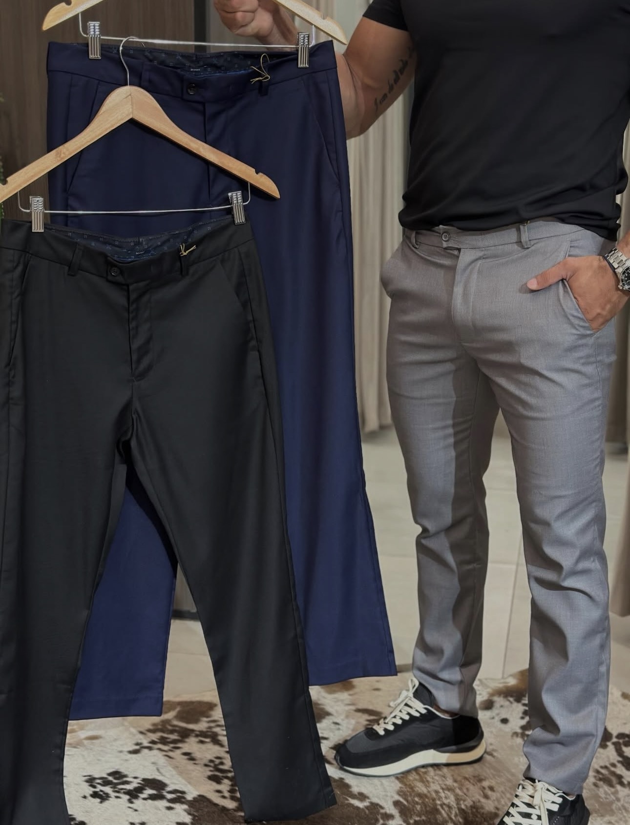Com modelagem Slim, entrega um caimento ajustado que valoriza a silhueta sem comprometer a mobilidade, sendo ideal para diferentes ocasiões.