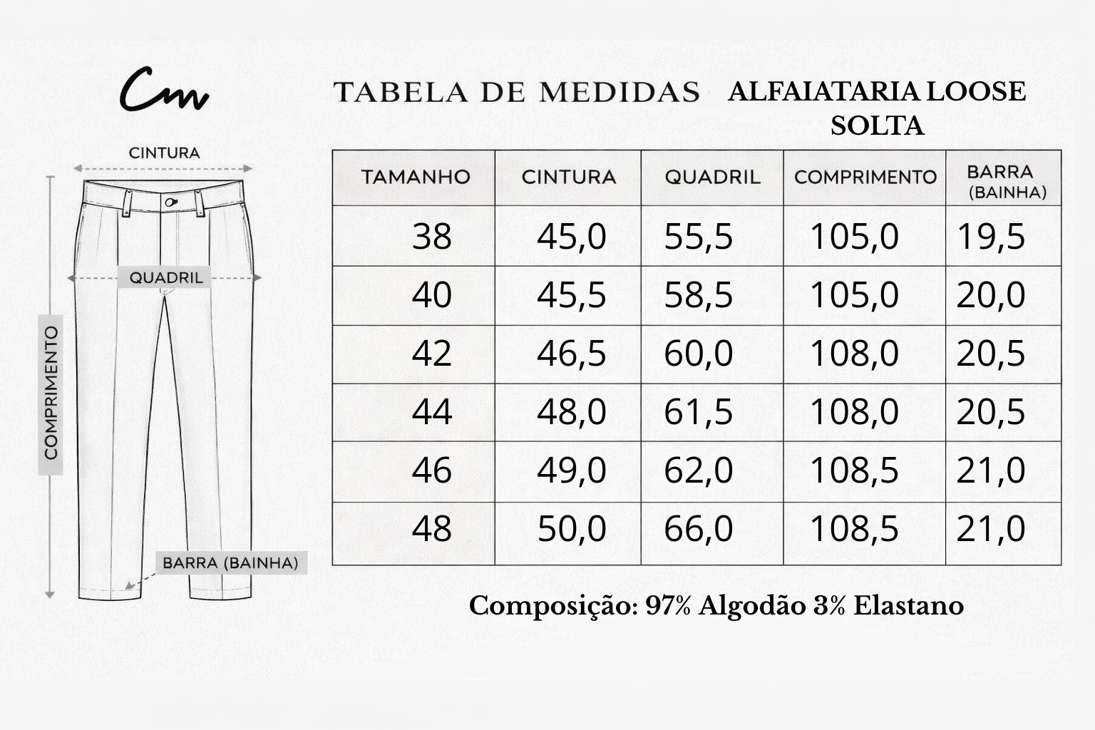 A modelagem Loose, com corte reto e solto, traz mais liberdade de movimento e uma proposta contemporânea — ideal para quem prefere um caimento mais relaxado sem abrir mão da elegância.