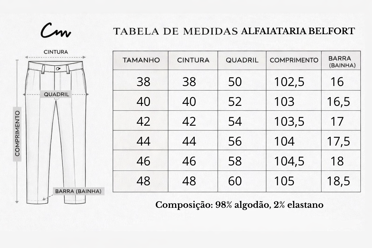 Composição: 98% Algodão, 2% Elastano
