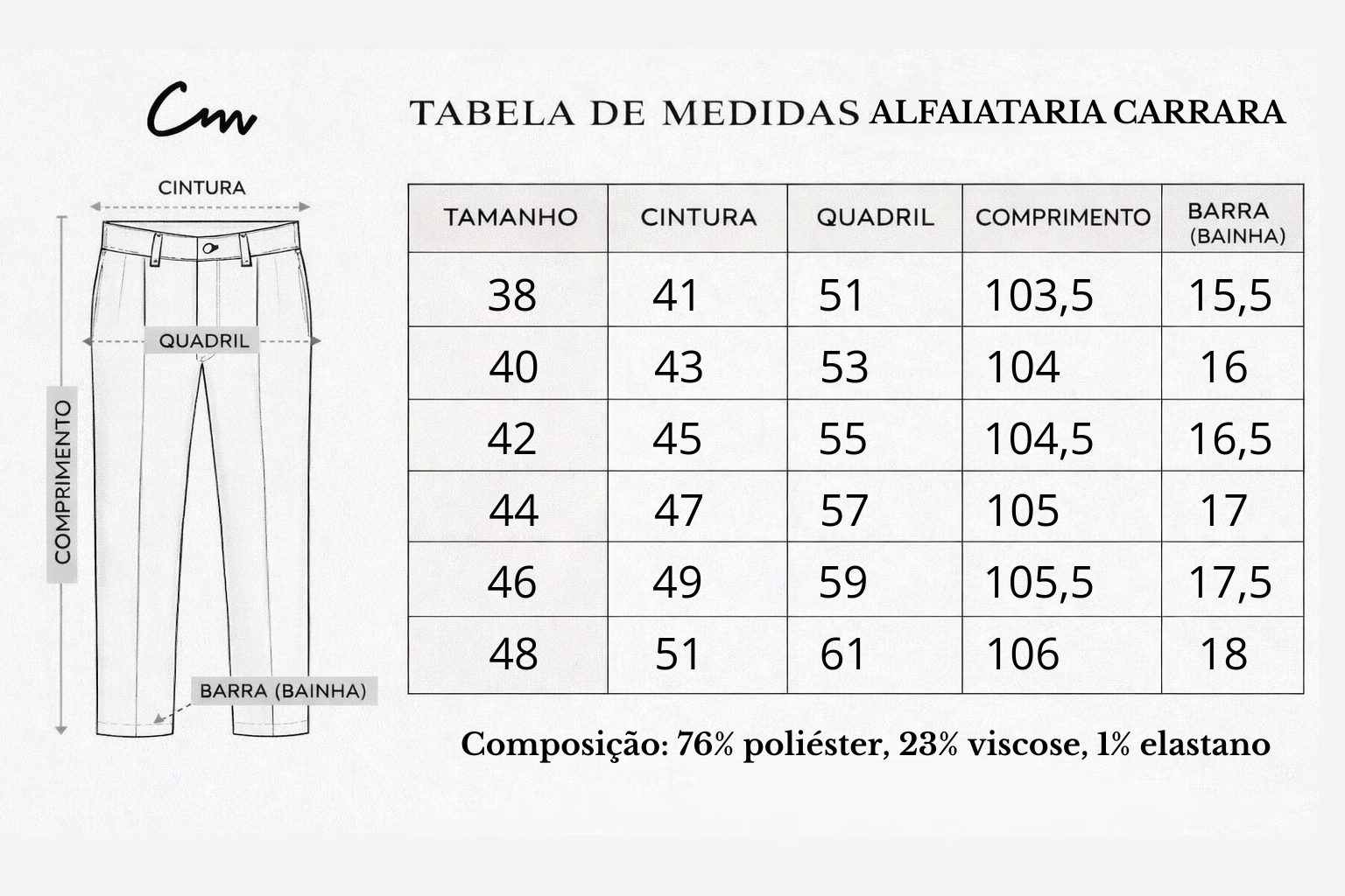 A Carrara é a escolha para quem busca uma alfaiataria alinhada, com conforto no dia a dia e um visual que foge do básico. Com modelagem bem estruturada, ela valoriza a silhueta mantendo liberdade de movimento.