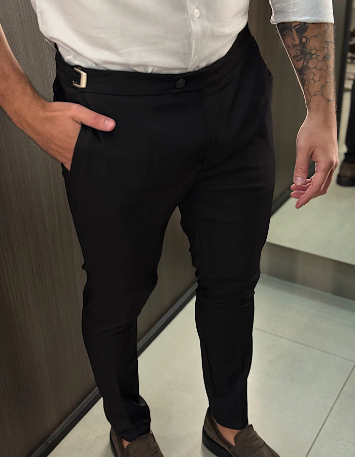 A calça de alfaiataria perfeita para unir conforto e sofisticação. Possui cós transpassado exclusivo e ajuste lateral interno, permitindo a regulagem de até dois tamanhos para um caimento ideal ao corpo.