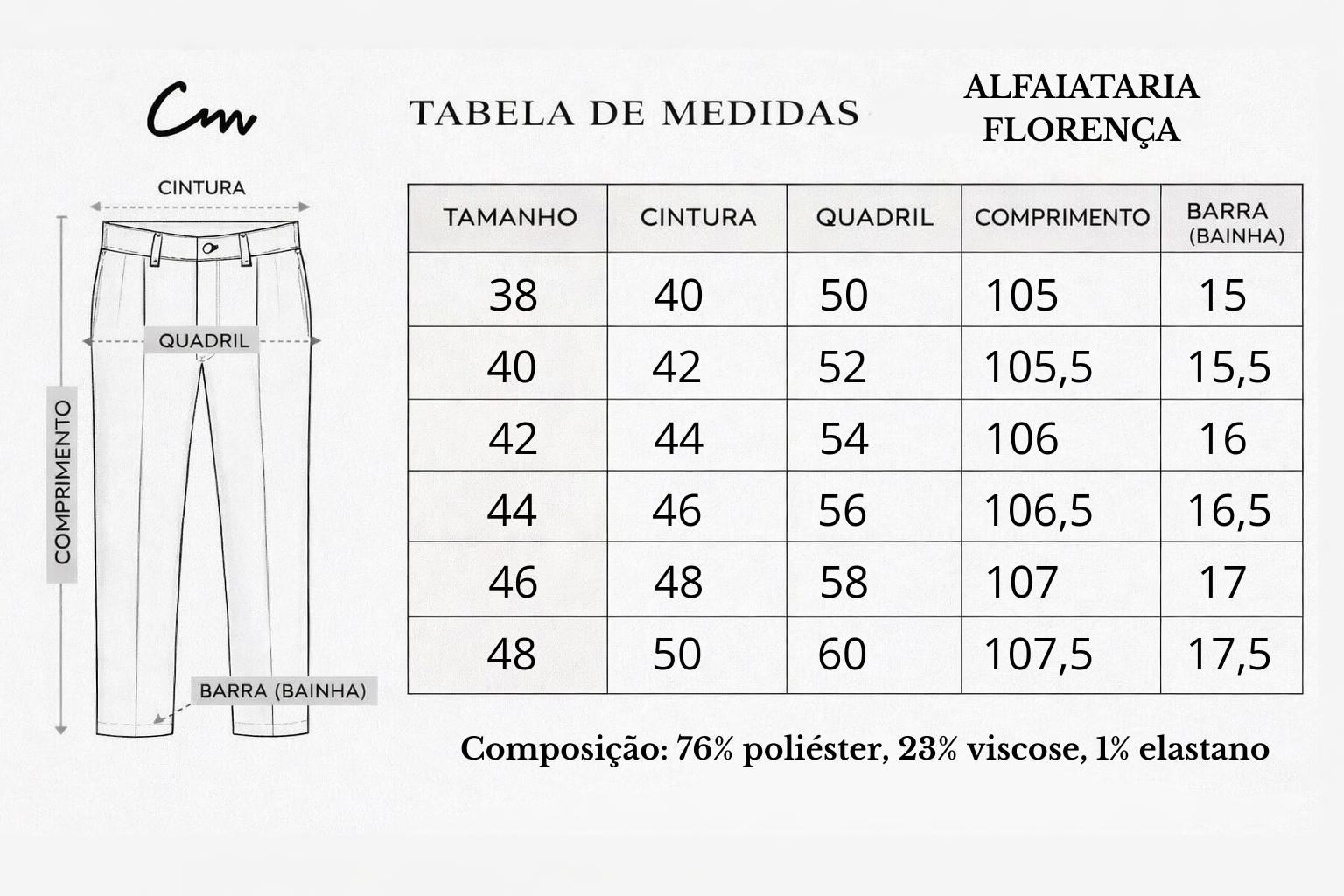 A Florença é a escolha certa pra quem busca uma calça alinhada, mas com um toque de diferenciação no visual. Com modelagem moderna e caimento limpo, ela valoriza a silhueta mantendo conforto no uso diário.