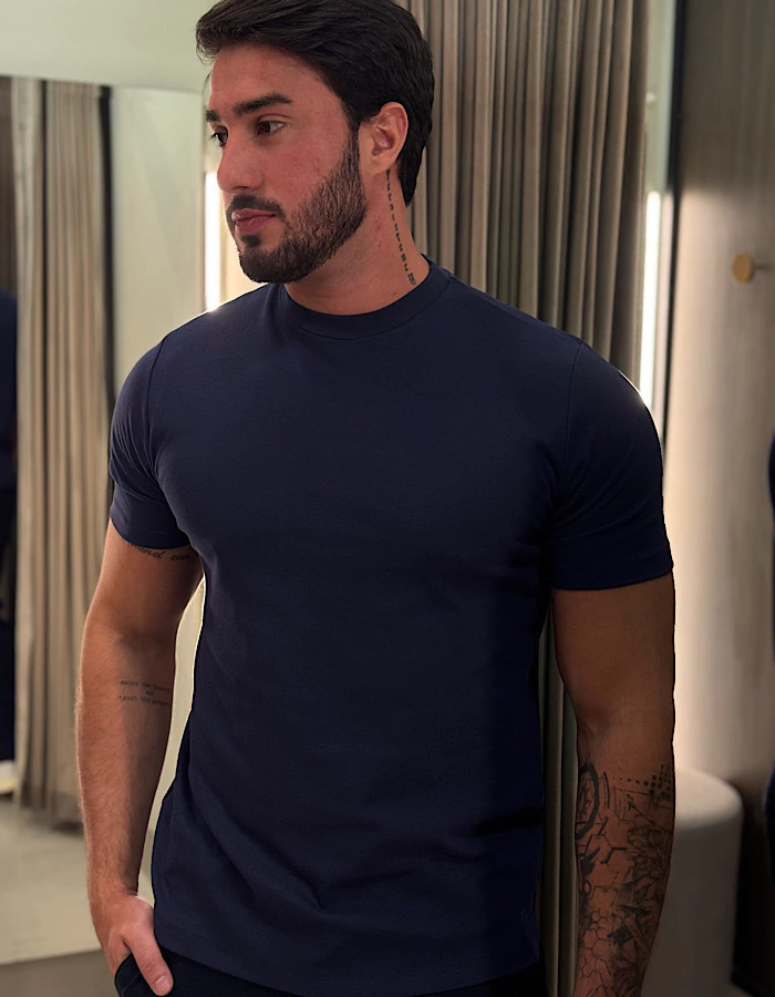 Uma peça minimalista e atemporal, feita em algodão suedine macio que garante conforto absoluto e um caimento sofisticado. A gola média adiciona um toque de elegância discreta, tornando essa camiseta perfeita para compor desde looks casuais até produções mais refinadas. Versátil, combina com tudo e se adapta a qualquer ocasião.