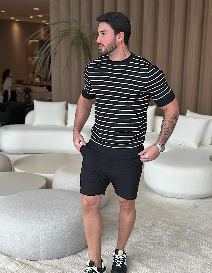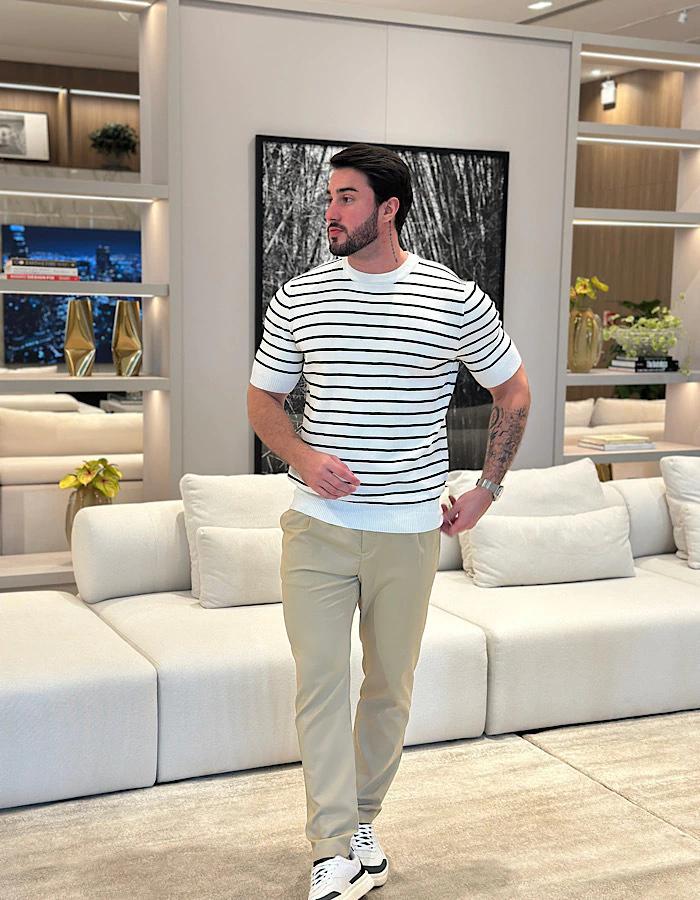 Confeccionada em tricô leve e macio, esta camiseta traz listras sutis na vertical que alongam a silhueta e destacam a elegância da peça. Uma das mais desejadas da coleção, combina versatilidade e estilo, podendo ser usada em qualquer ocasião.