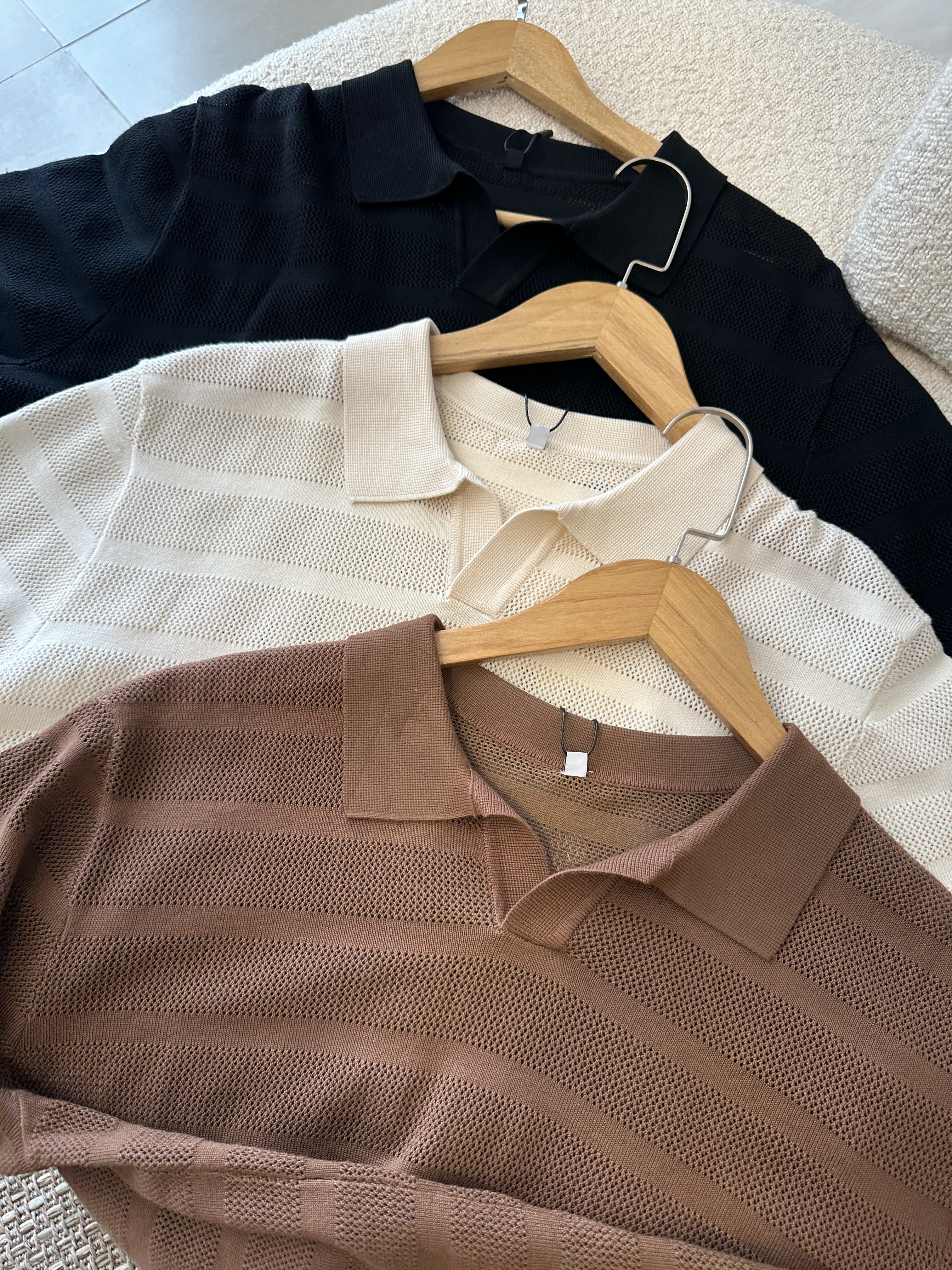 uma construção em listras horizontais com diferentes tramas, que cria profundidade, relevo e um visual muito mais rico do que uma polo básica.