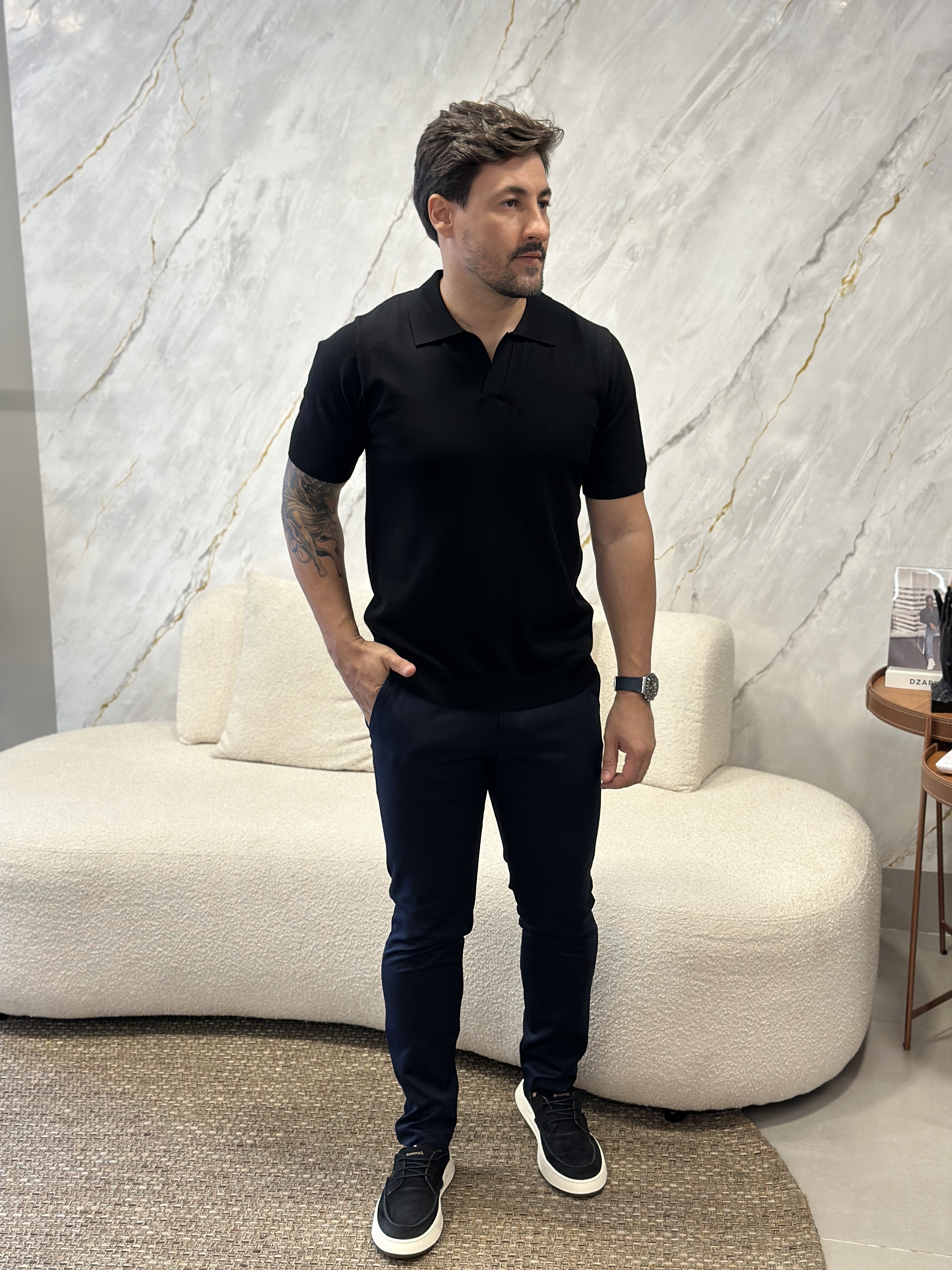 A Polo de Tricô Amalfi é uma peça pensada para quem busca um visual mais sofisticado, com acabamento limpo e presença discreta.